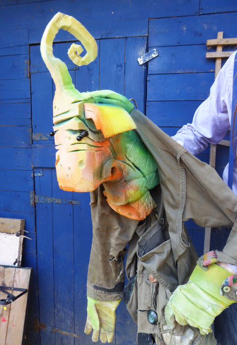 Joy Rummage has come out of collaborative artists puppet making days. The puppets are personalized creations of each artist; using carved foam and latex scrim, we create highly flexible, tough, easy to manipulate figures of any size. This is followed by ‘rummaging’: playing / intuitively mucking about in large indoor or outdoor spaces, to the accompaniment of improvised jamming by local musicians. Stress is minimized by the deliberate letting go of choreography and rehearsal, a simple set up, having a bank of performers, and cake. It has become a flexible event that can turn up anywhere – shopping centre, council estate, park, or designated theatrical spaces